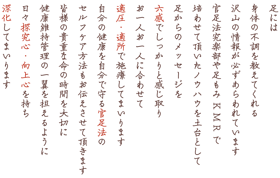 この「官足法」を伝承していく使命を胸に、日々施療、セルフケア法をお伝えさせて頂いております。